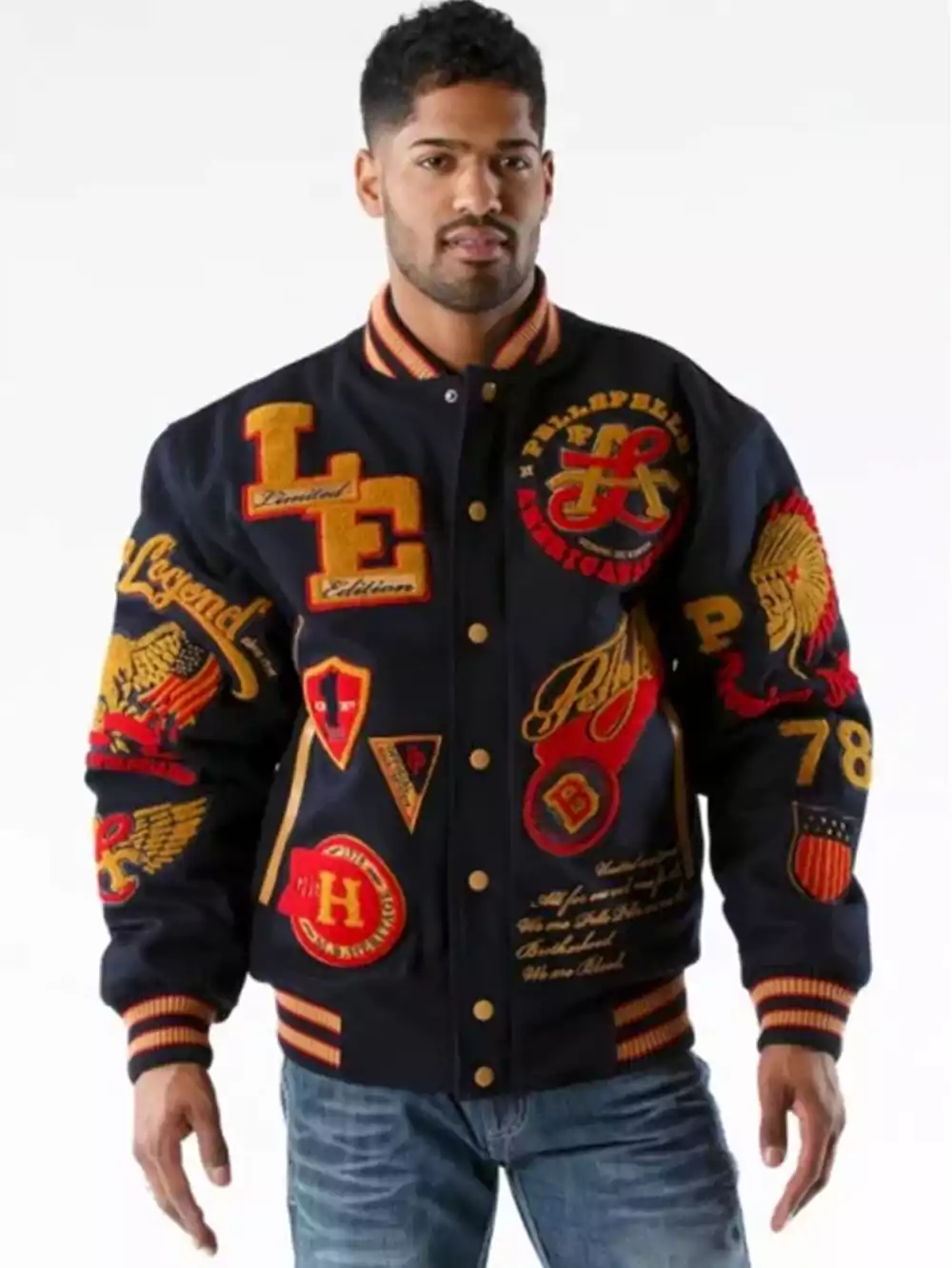 Black as the city skyline at midnight. The Pelle Pelle American Legend Varsity Men Wool Jacket drapes over shoulders with a weight of heritage, wool crafted for warmth and presence. Buttoned closure, rib-knitted collar, cuffs that hold shape, two side pockets ready for essentials or attitude.