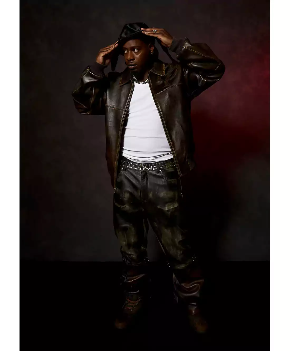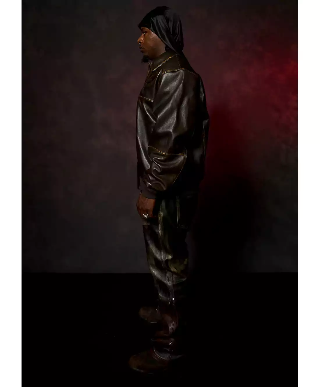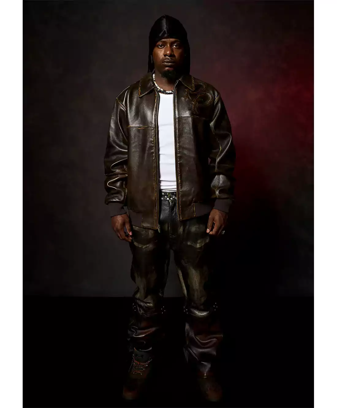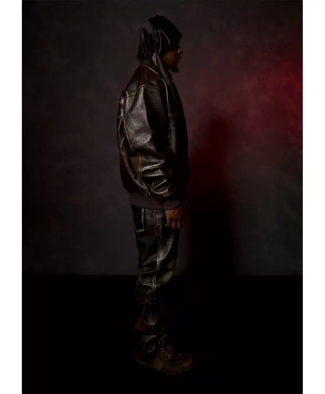 Heavy rib-knit hems keep the structure sharp, holding shape against the city’s rush. The brown abrasion finish tells its own story, one of long nights and bright ambition. Every line feels lived in. Every shine feels earned.